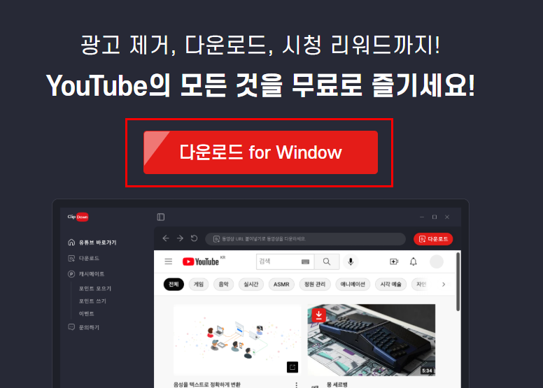 클립다운은 가볍고 안정적인 프로그램으로 설계되어 Windows PC에서도 원활하게 동작하며, 사용자가 손쉽게 영상 콘텐츠를 관리하고 저장할 수 있도록 돕습니다.
