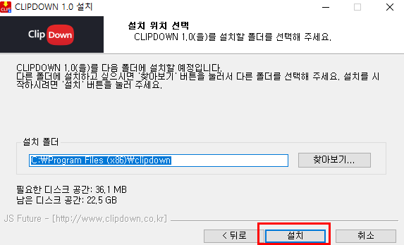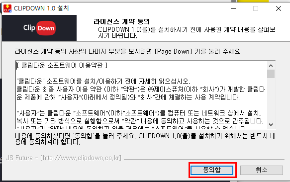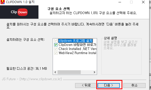 클립다운 설치 파일을 다운로드한 후 실행하고 다음 > 버튼을 클릭합니다.